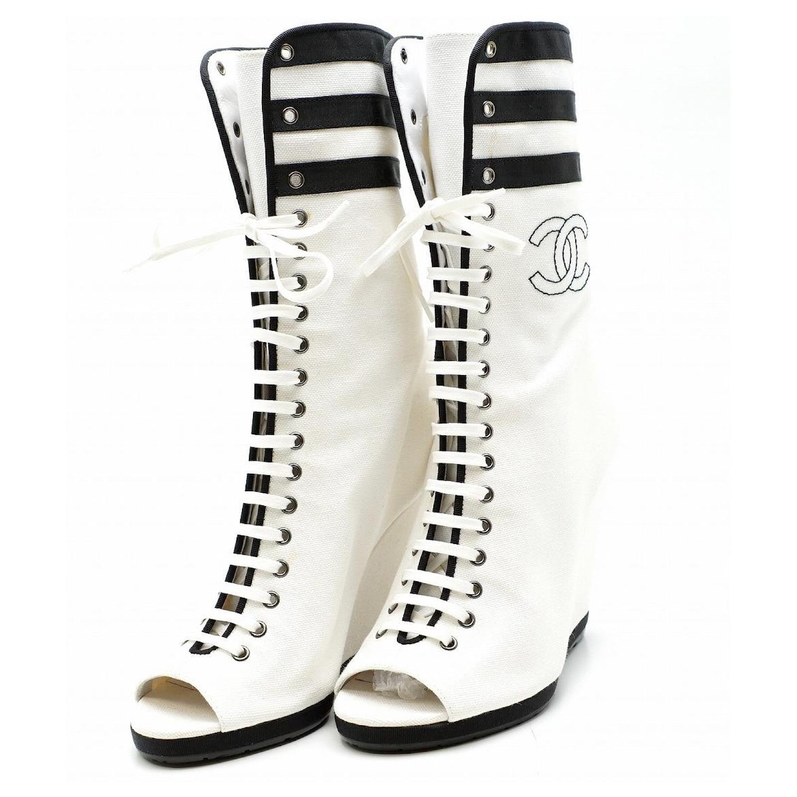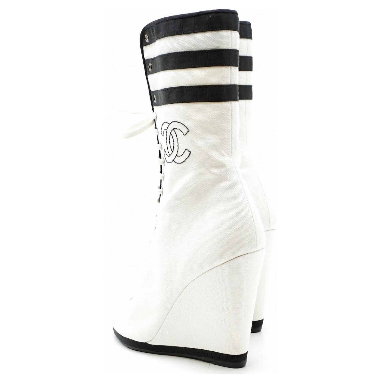 Chanel Resort 2010 white and black canvas peep-toe wedge boots. - Eu 37.5
